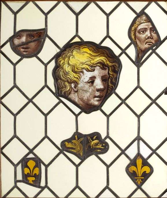 VITRAIL composé de fragments polychromes : tête, deux visages, deux fleurs de lys et deux têtes de chimères. XVe et XVIe siècleDans un encadrement de fenêtre