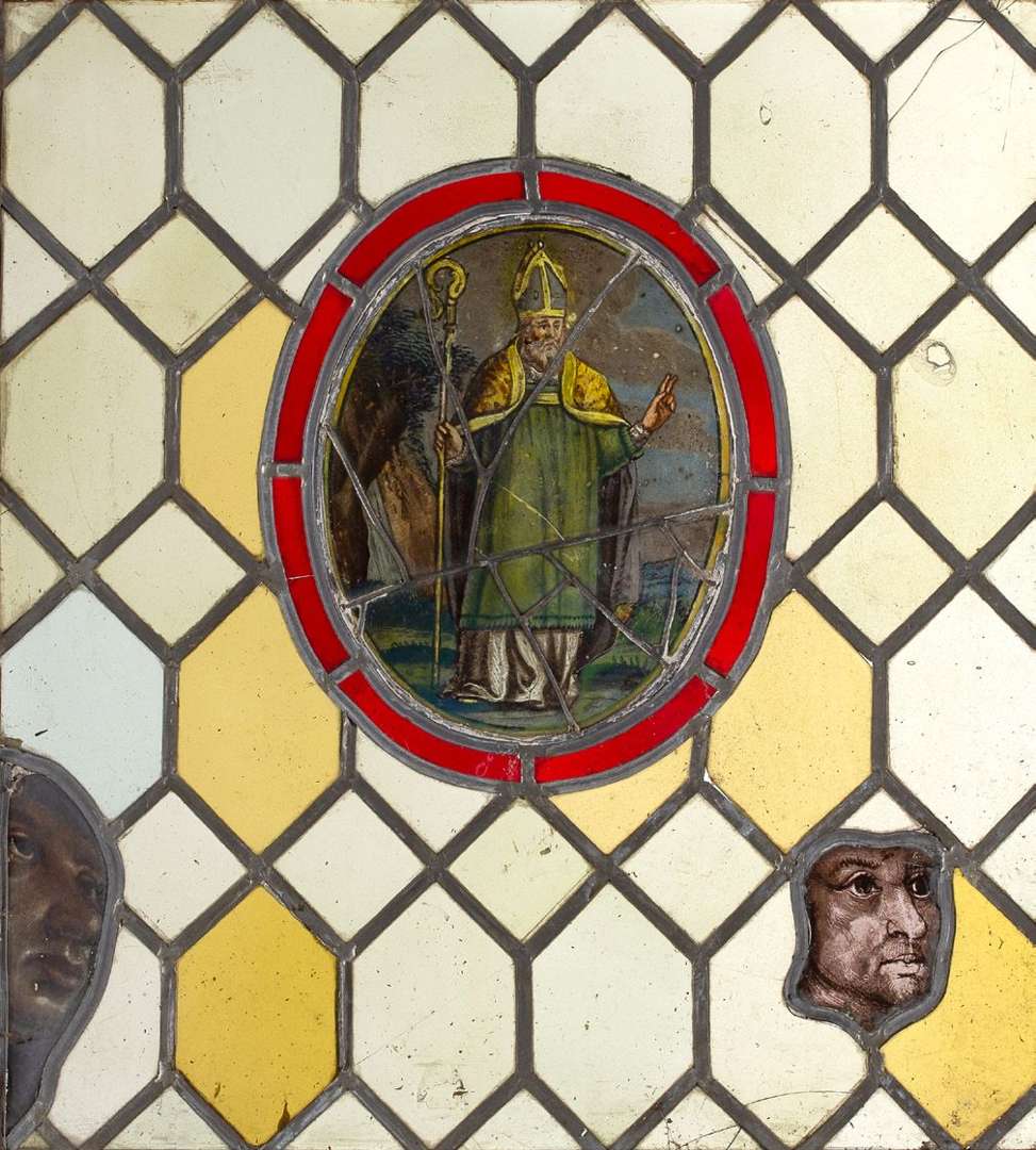 VITRAIL polychrome composé d'un médaillon représentant un saint Évêque et de deux fragments avec visages. XVIe et XVIIe sièclesDans un encadrement de fenêtre