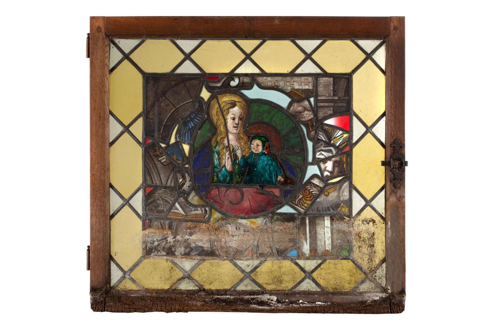 VITRAIL polychrome composé d'un buste de Vierge à l'Enfant entouré de différents fragments XVIe siècleDans un encadrement de fenêtre