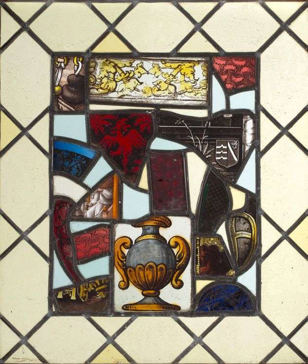 VITRAIL polychrome composé de différents fragments : motifs végétaux, aigle, vase, personnage trônant, bouclier, gourde de pèlerin, armoiries. XVe et XVIe sièclesDans un encadrement de fenêtre