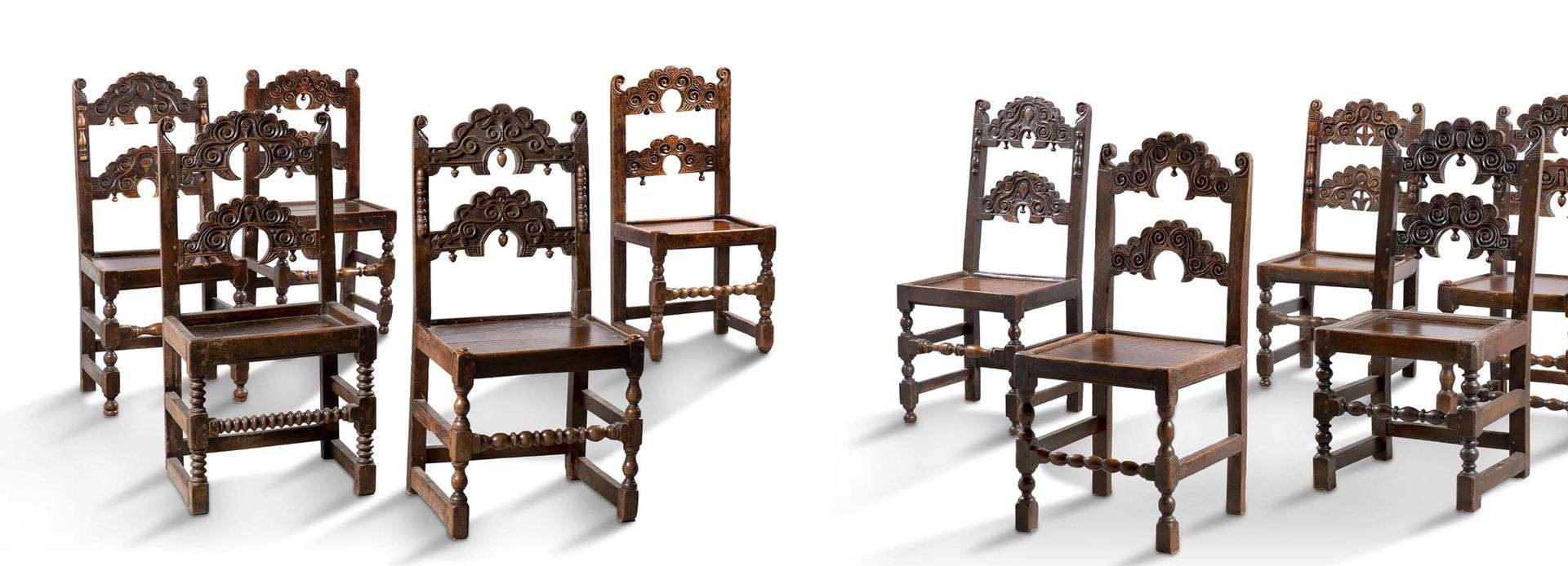 DIX CHAISES en chêne. Piètements antérieurs tournés en chapelet, disques ou balustres, dossiers à deux bandeaux arqués et sculptés à décor varié de volutes et mascarons, assises en bois. Marque de propriétaire PB au dossier sur l'une d'elles. Angleterre, sud du Yorkshire, dernier tiers du XVIIe siècle