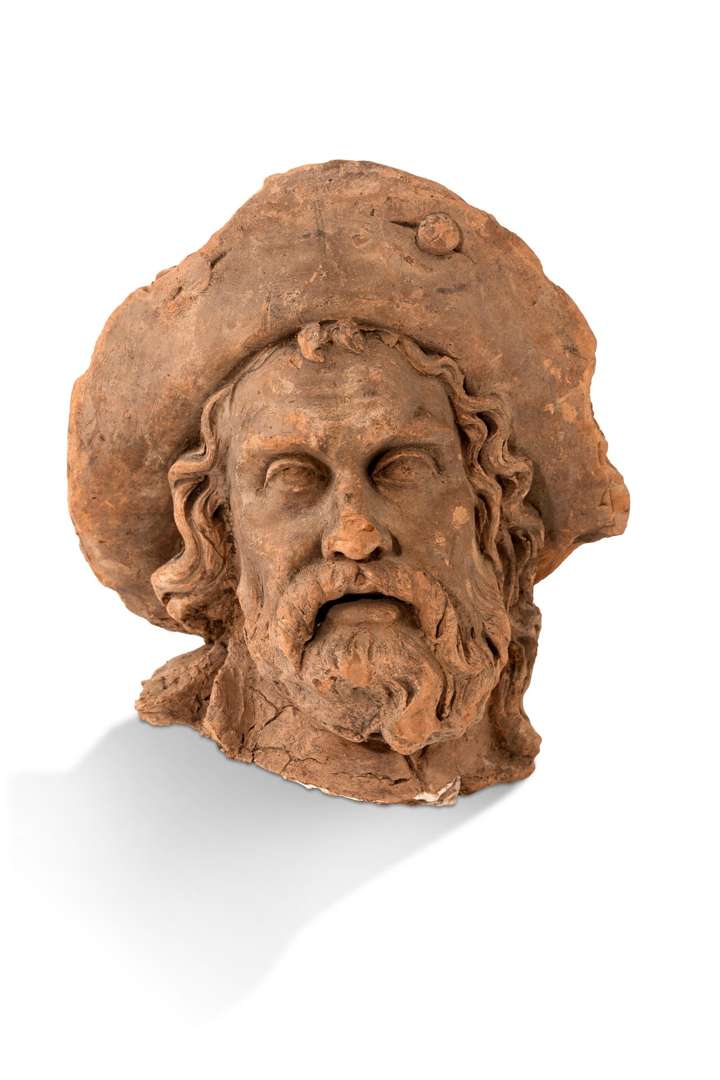 TÊTE D'UN SAINT PÉLERIN en terre cuite. Coiffé d'un chapeau au bord relevé
