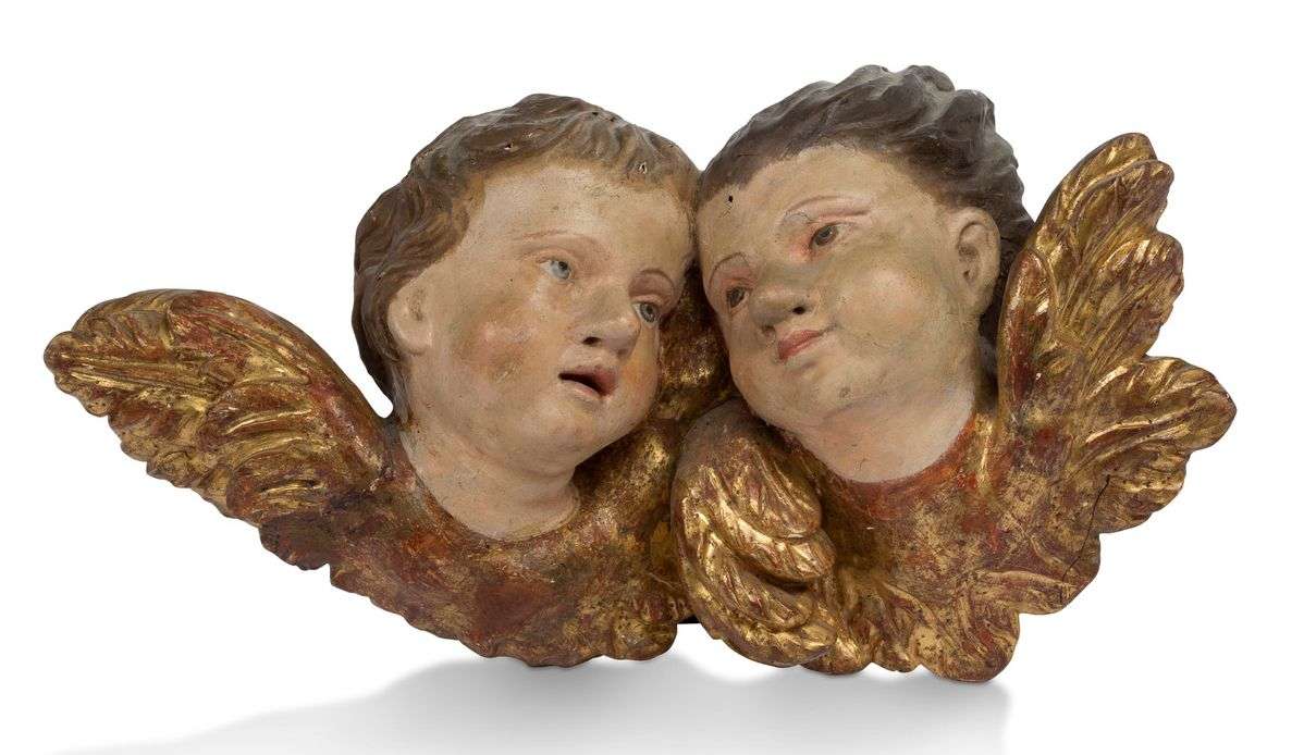 DEUX TÊTES D'ANGELOTS en bois sculpté, polychromé et doré.XVIIIe siècle