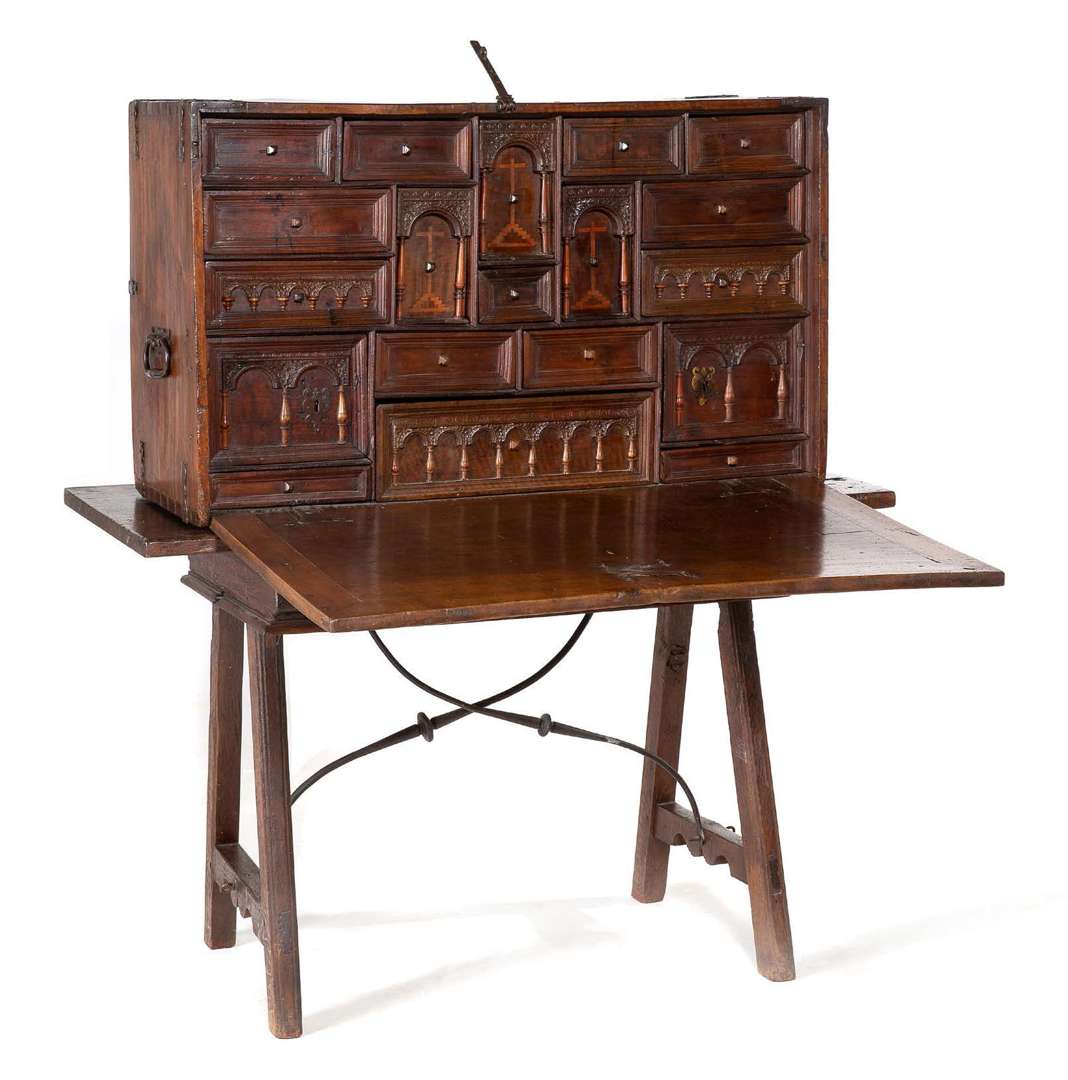 BARGUEÑO en noyer sculpté avec incrustations ouvrant par un abattant sur dix-sept tiroirs et deux vantaux à décor d'arcatures et de colonnettes | poignées latérales et serrure à moraillon en fer forgé. Il repose sur une table ouvrant par un tiroir en façade aux pieds divergents reliés au plateau par une entretoise en fer forgé.Espagne, XVIIe siècle
