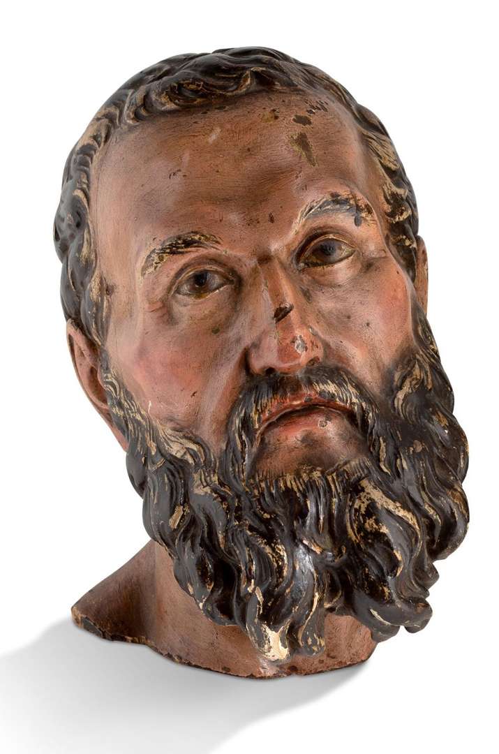 IMPORTANTE TÊTE D'HOMME BARBU en bois sculpté et polychromé. Visage expressif aux traits réalistes. Italie du Sud, Naples ?, fin du XVIIIe siècle