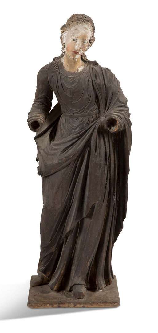 VIERGE en bois de résineux sculpté en ronde-bosse avec restes de polychromie. Debout, légèrement déhanchée, elle est revêtue d'une longue robe ceinturée et d'un manteau dont un pan repose sur le bras gauche. Naples, XVIIIe siècle