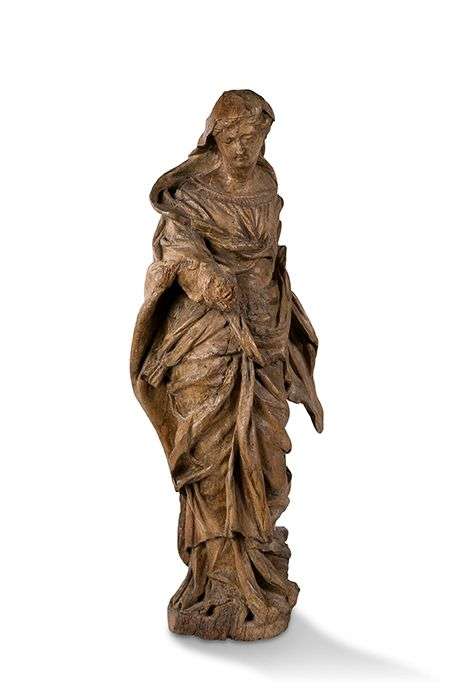 VIERGE BAROQUE en tilleul sculpté. Debout, elle est vêtue d'une robe ceinturée et coiffée d'un voile formant manteau. Fin du XVIIe / début du XVIIIe siècle