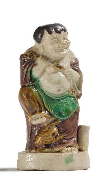Porte-baguettes à encens en biscuit et émaux sancai, représentant un Liuhai accompagné de son crapaud.