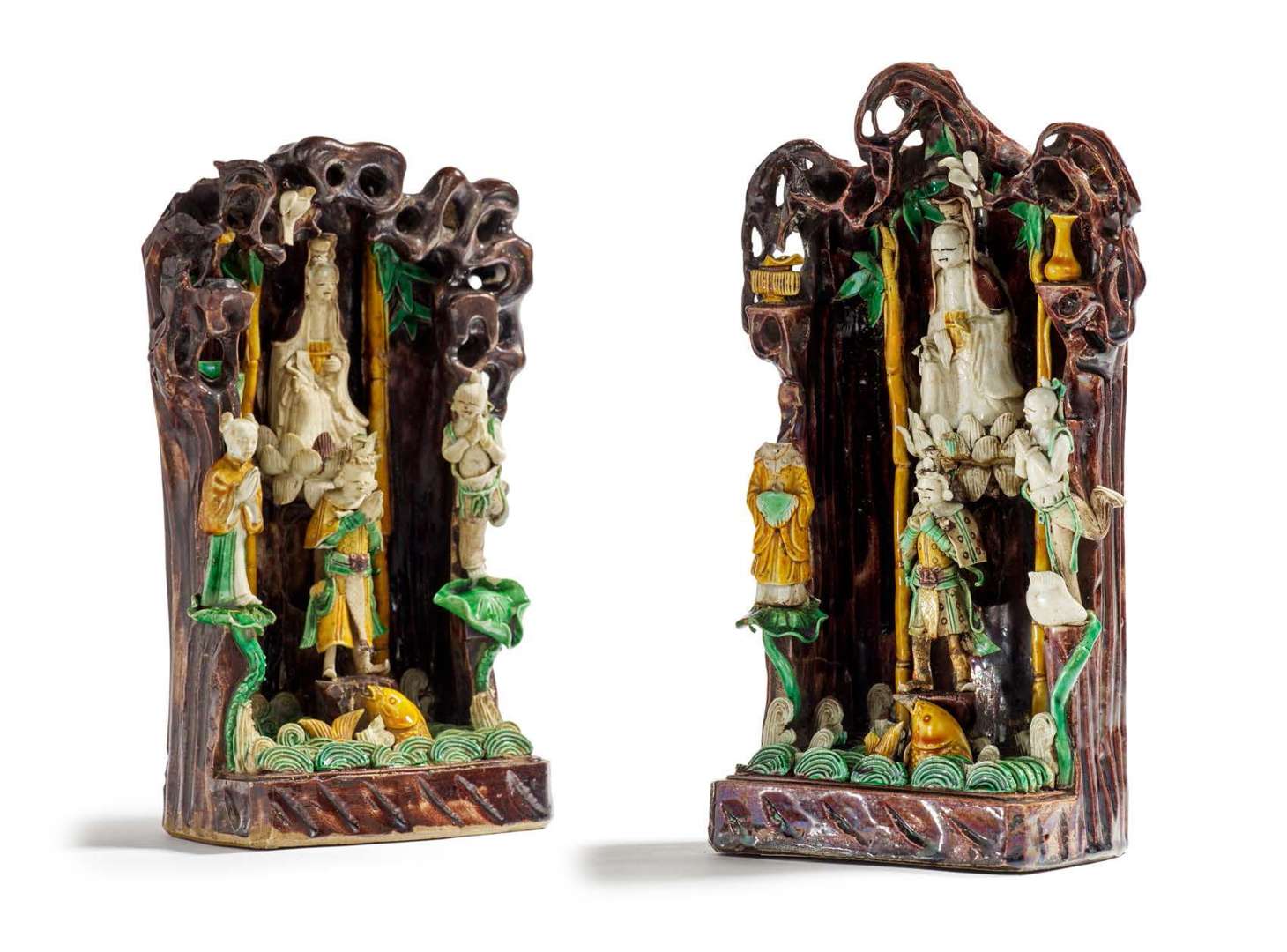 Deux groupes en biscuit et émaux sancai, représentant une grotte à l'intérieur de laquelle on retrouve Guanyin assise en délassement royal sur un lotus entouré de bambous, entourée d'adorant (l'un manquant), devant la divinité se trouve un gardien céleste. La base est ornée d'une carpe émergeant de flots écumants.