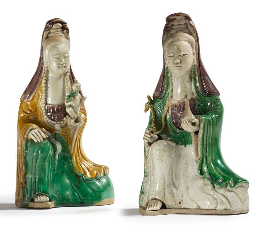 Deux statuettes en biscuit et émaux sancai, représentant Guanyin assise en délassement royal (lalitasana), l'une tenant un enfant dans ses bras et un chasse-mouche, l'autre un vase et un lotus.