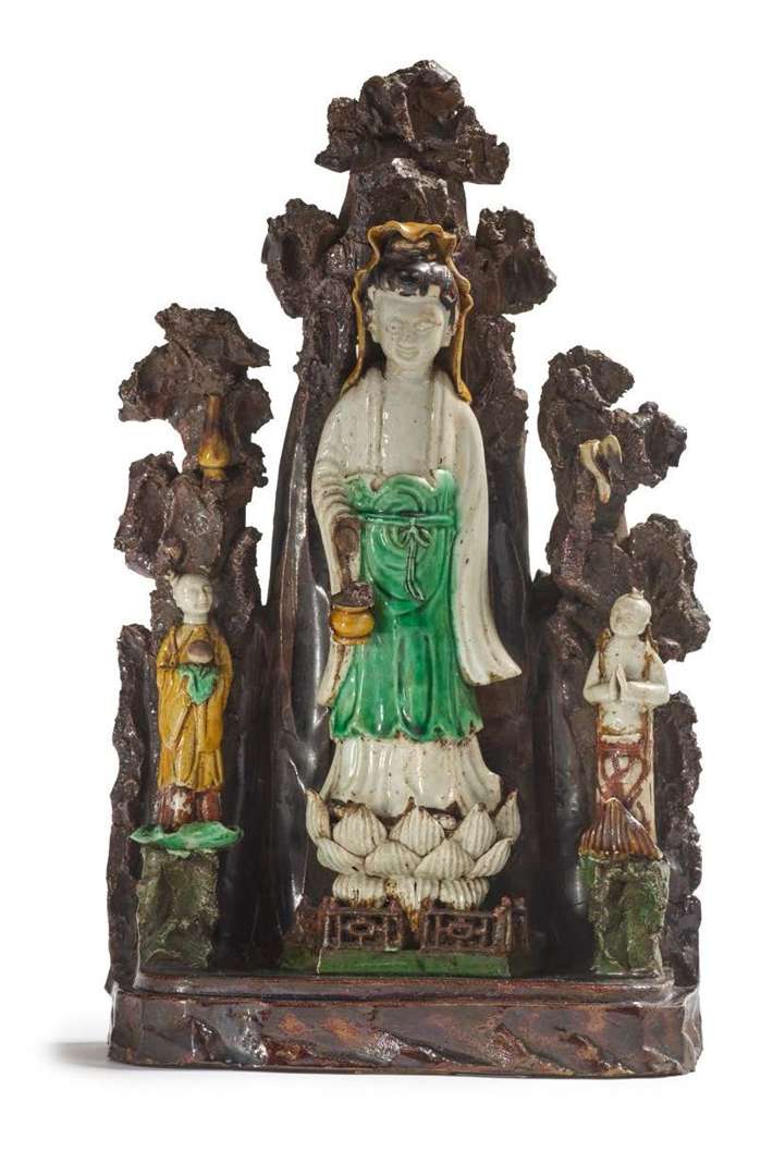 Groupe en biscuit et émaux sancai, représentant Guanyin debout sur un lotus, accompagné d'adorants, devant un rocher.