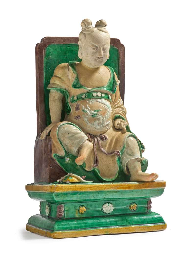 Groupe en biscuit et émaux sancai, représentant un jeune dignitaire assis en délassement royal sur un trône, le vêtement à décor de dragon en relief, une tortue à ses pieds.