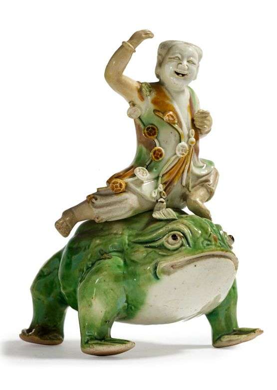 Groupe en biscuit et émaux sancai, représentant Liu Hai sur le crapaud céleste.