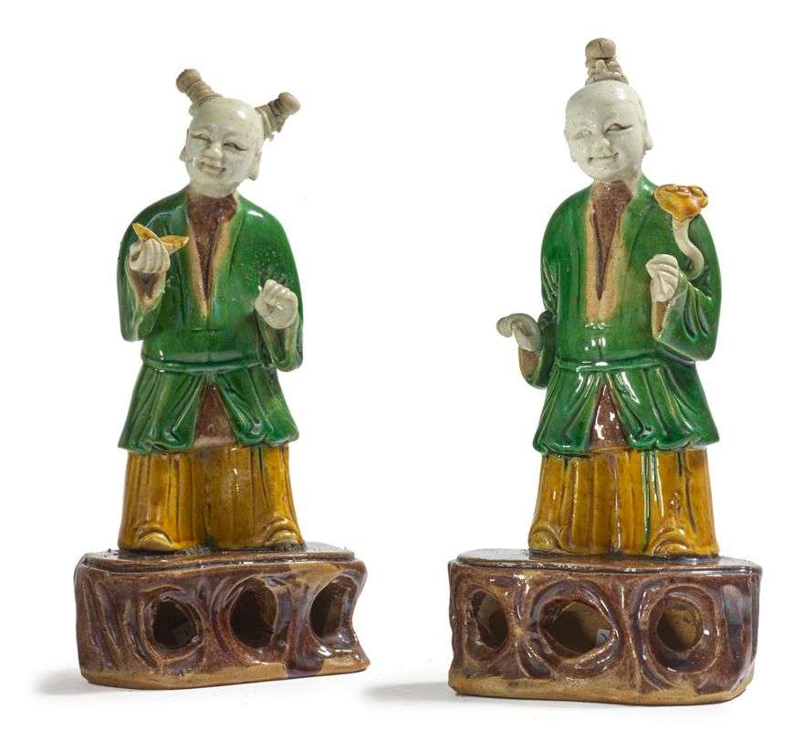 Deux statuettes en biscuit et émaux sancai, représentant deux enfants debouts sur une roche percée, l'un tenant un sceptre ruyi, l'autre un lingot.