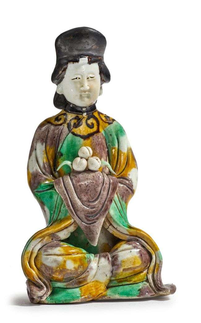 Groupe en biscuit et émaux sancai, représentant une porteuse d'offrandes assise en méditation tenant une pyramide de pêches de longévité.