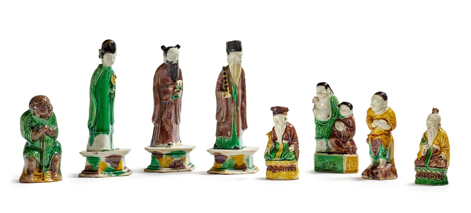 Huit statuettes en biscuit et émaux sancai, représentant Li le Boiteux, des immortels, deux dignitaires sur un lotus, les frères Hoho.