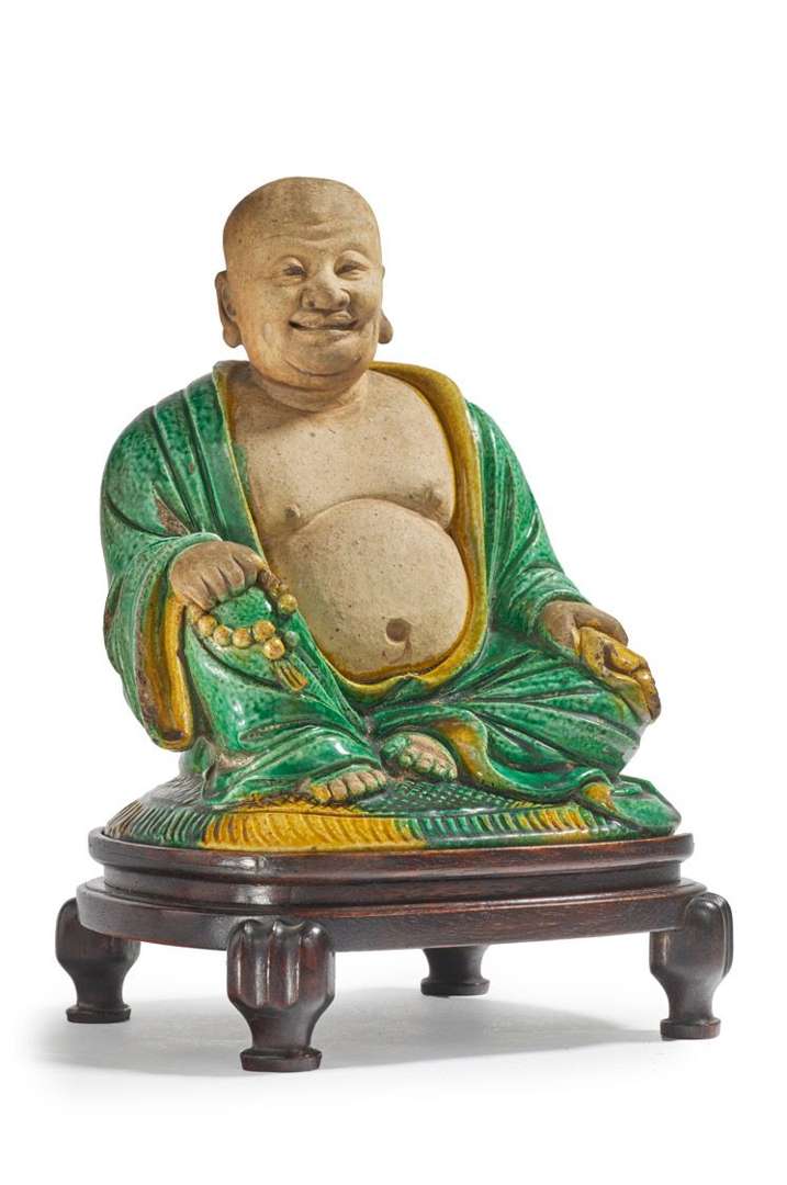 Groupe en grès porcelaineux émaillé vert et jaune, représentant Milefo assis sur le sac des richesses, tenant le rosaire à la main.