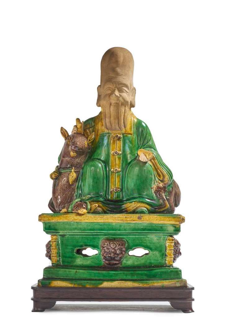 Groupe en biscuit et émaux sancai, représentant Zhoulao assis sur son daim, tenant le rouleau de la loi, une tortue à ses pieds, sur une base quadrangulaire ornée de masques.