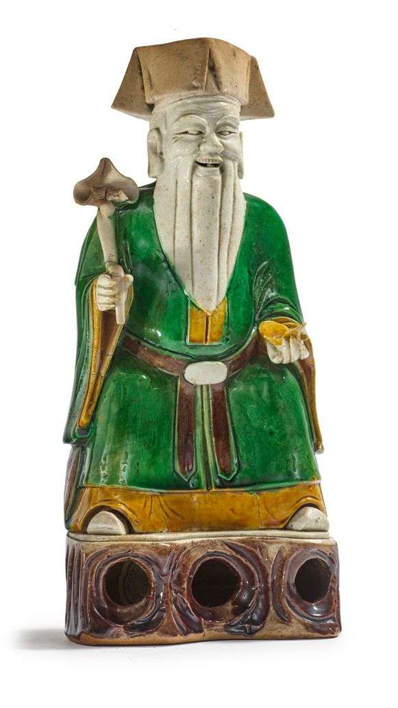 Statuette en biscuit et émaux sancai, représentant le dieu de la fortune tenant un lingot et une tige de lotus. H. 25,5 cm (Petit manque à un doigt, rebouchage et fêle à la base)