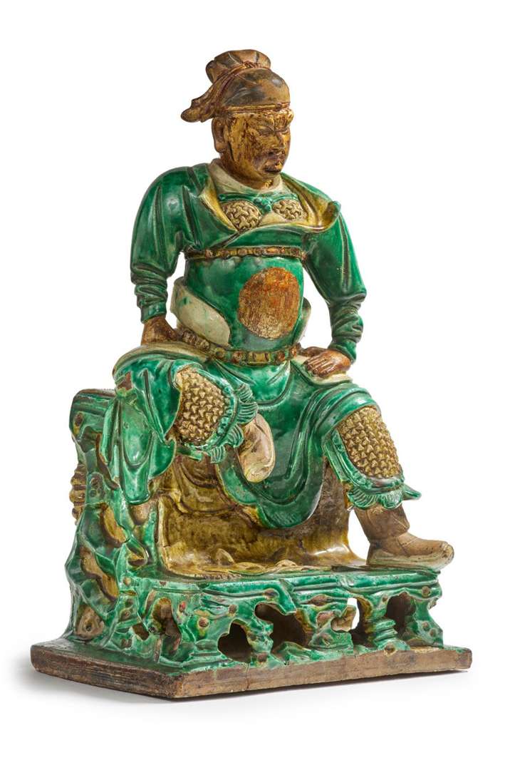 Important groupe en grès et émaux sancai, représentant Guan Yu assis sur un rocher en armure avec à ses pieds la peau de tigre. Inscription au dos.