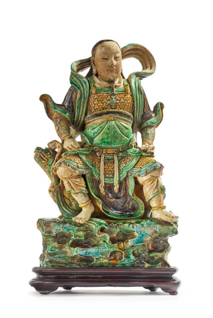 Important sujet en grès émaillé sancai et bleu, représentant Guandi en armure, assis sur un lion, reposant sur une roche percée.