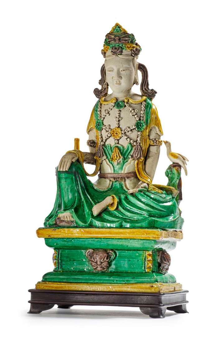 Statuette en biscuit et émaux sancai, représentant Avalokiteshvara, assise en lalitasana, richement parée, avec réminiscence d'Amitabha dans la coiffe, accompagnée d'un oiseau et vase à eau lustral.