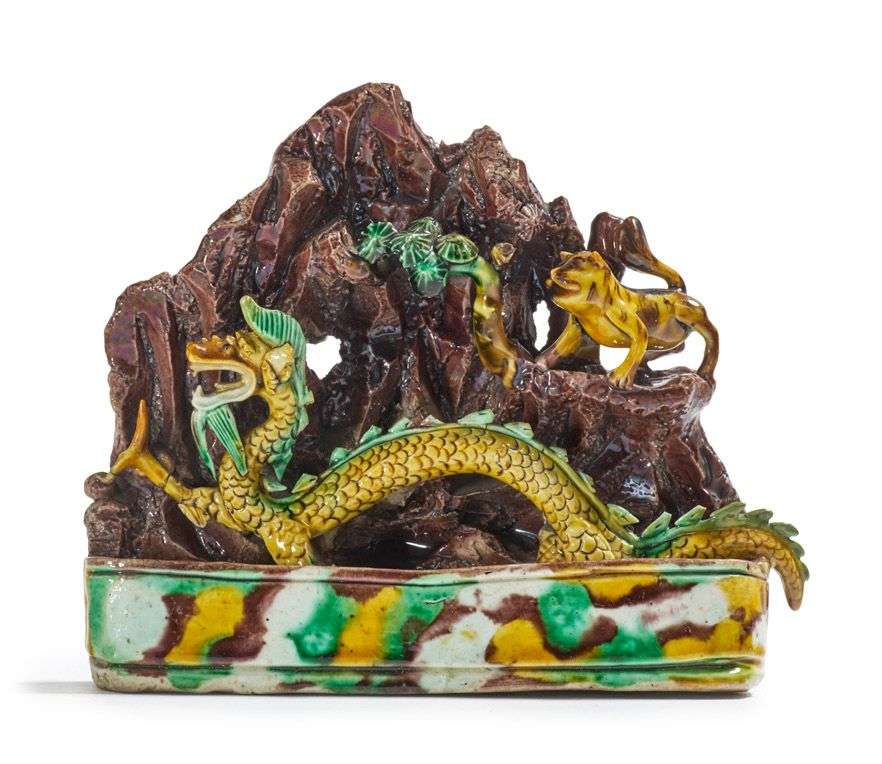 Godet de peintre en biscuit et émaux sancai, à décor d'un dragon et d'un tigre évoluant parmi des pics montagneux.