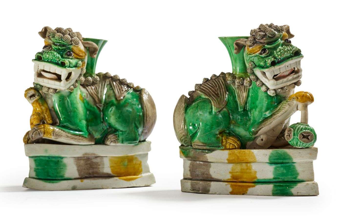 Couple de lions bouddhiques en biscuit et émaux sancai, représentés allongés sur une feuille supportant un vase floriforme.