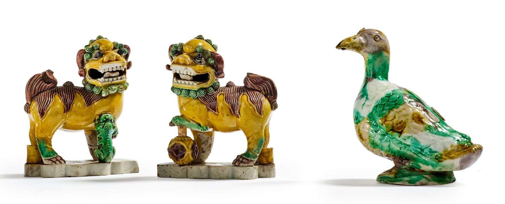 Paire de statuettes en biscuit et émaux sancai, en forme de lions bouddhiques.