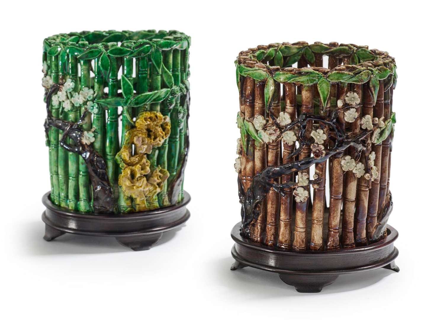 Paire de bitong en biscuit et émaux sancai, l'un à dominante manganèse, l'autre à dominante verte, à décor ajouré de bambous, entrelacés de fleurs de prunus et branches de pin de longévité, représentant les trois amis de l'hiver.