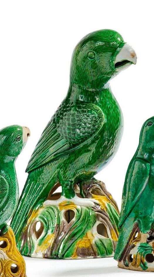 Couple de grandes perruches en biscuit et émaux sancai sur des rochers ajourés.