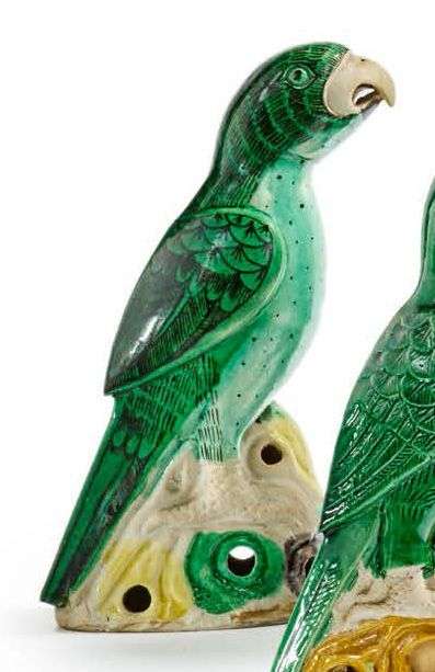Couple de perruches en biscuit et émaux sancai sur des rochers ajourés. Avec socles en bois.