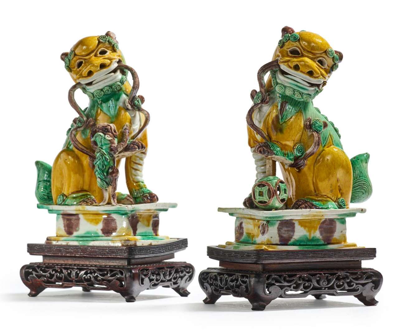 Paire de porte-baguettes à encens en biscuit et émaux sancai, en forme de lions bouddhiques.
