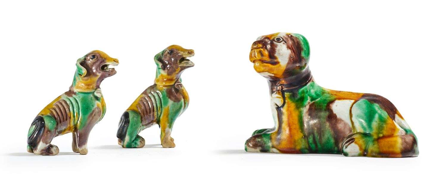 Trois sujets en biscuit et émaux sancai, représentant trois chiens au repos, l'un allongé.