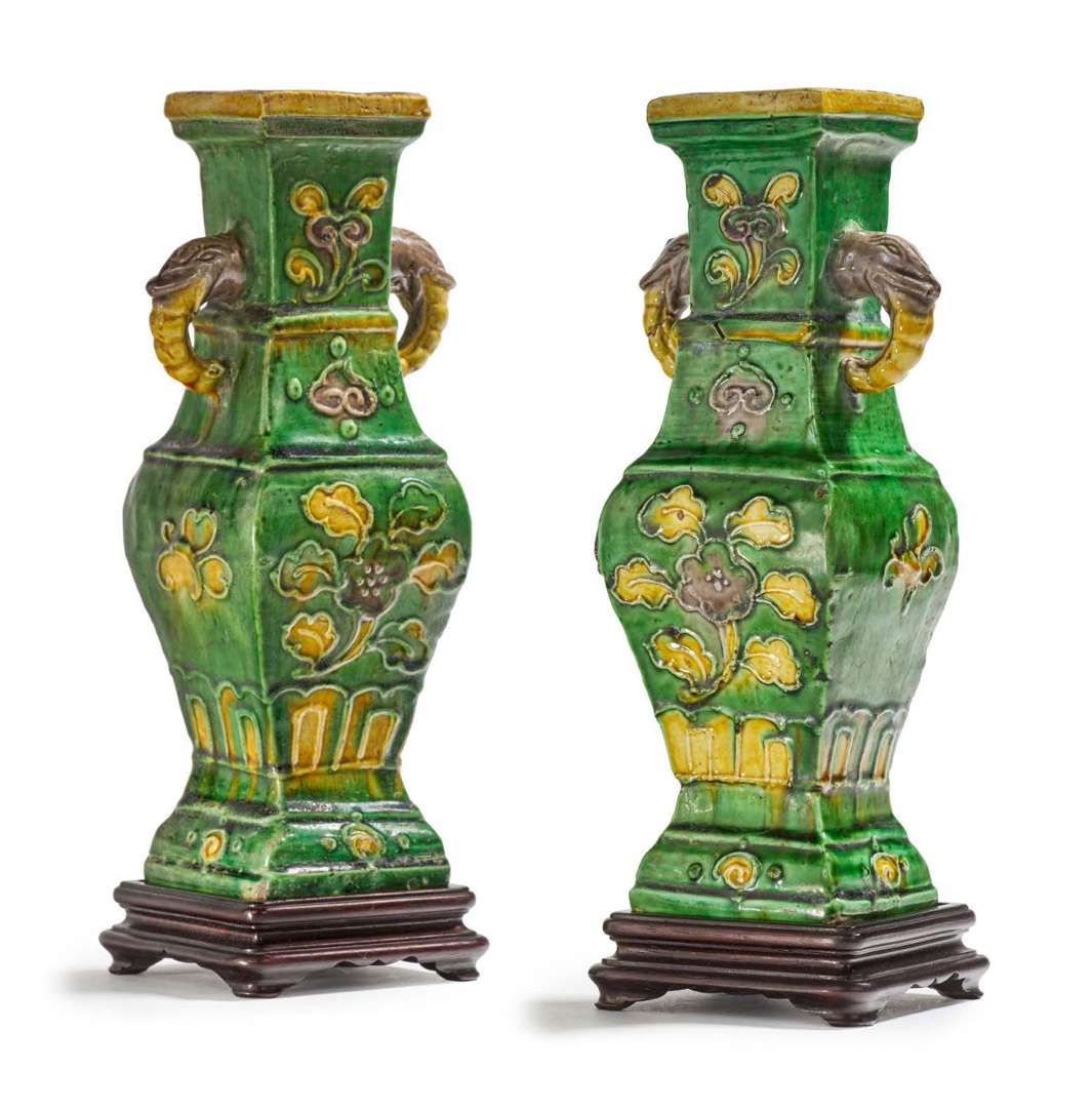 Paire de vases balustres quadrangulaires en biscuit et émaux sancai, finement décorés en léger relief de papillons, lingzhi, compositions florales. Anses crachées par des têtes d'animaux fantastiques.