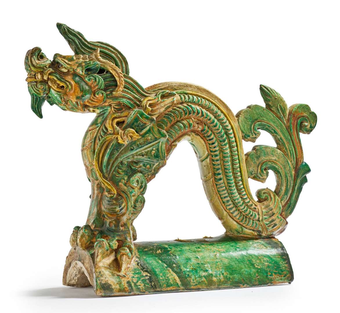 Grand épi de faîtage en grès émaillé sancai, représentant un dragon ailé en mouvement.