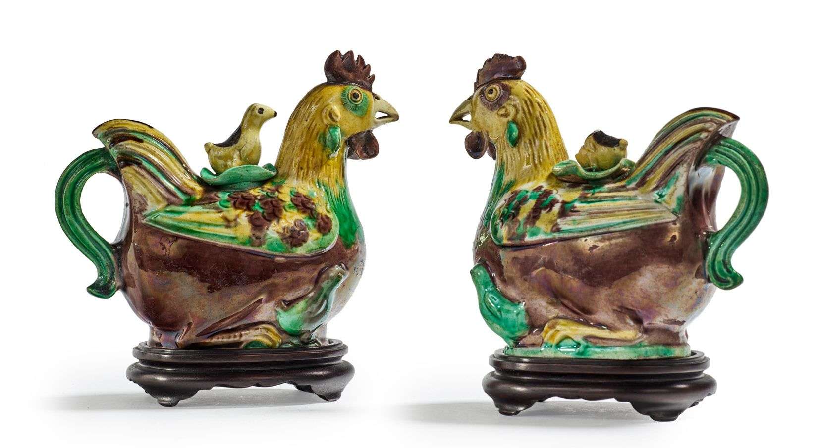 Paire de théières en forme de coqs en biscuit et émaux sancai, prises formées de poussins sur un lotus.