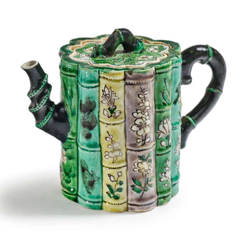 Théière en biscuit et émaux sancai, en forme de bambou, à décor de fleurs de prunus, et oiseaux.