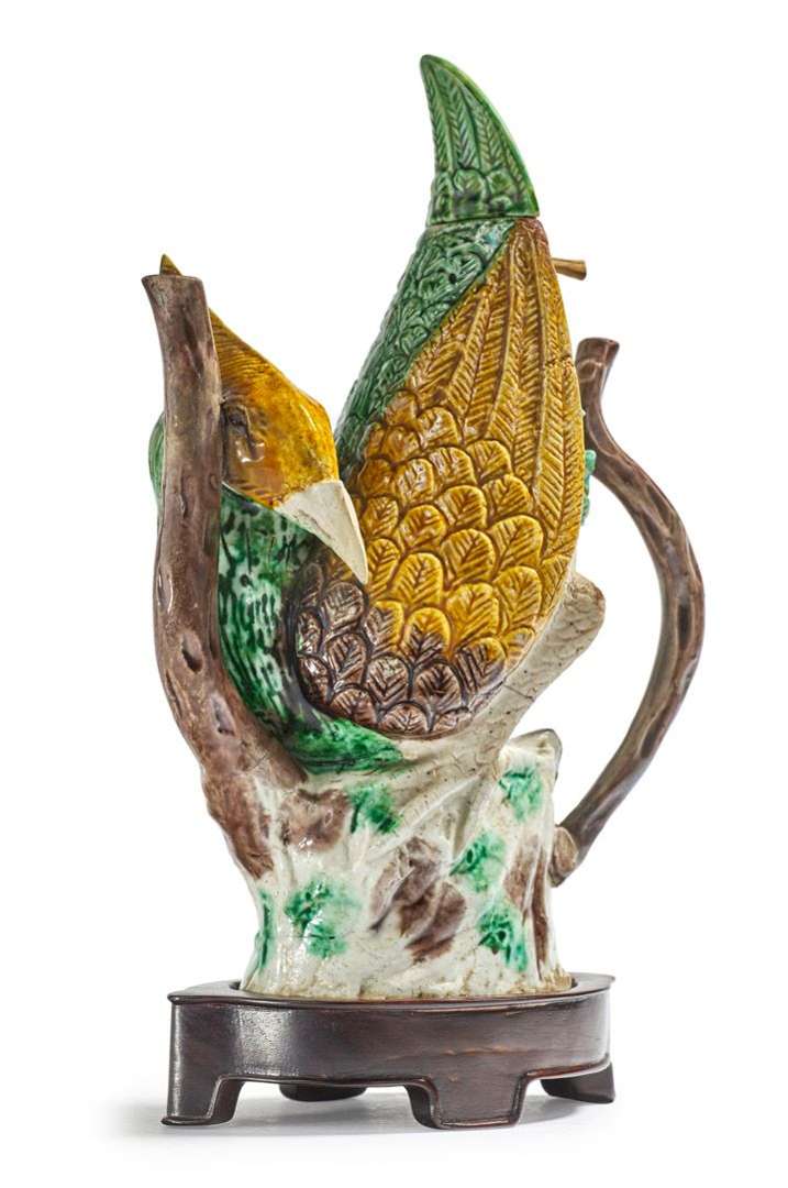 Théière en biscuit et émaux sancai, reprenant la forme d'un faisan.