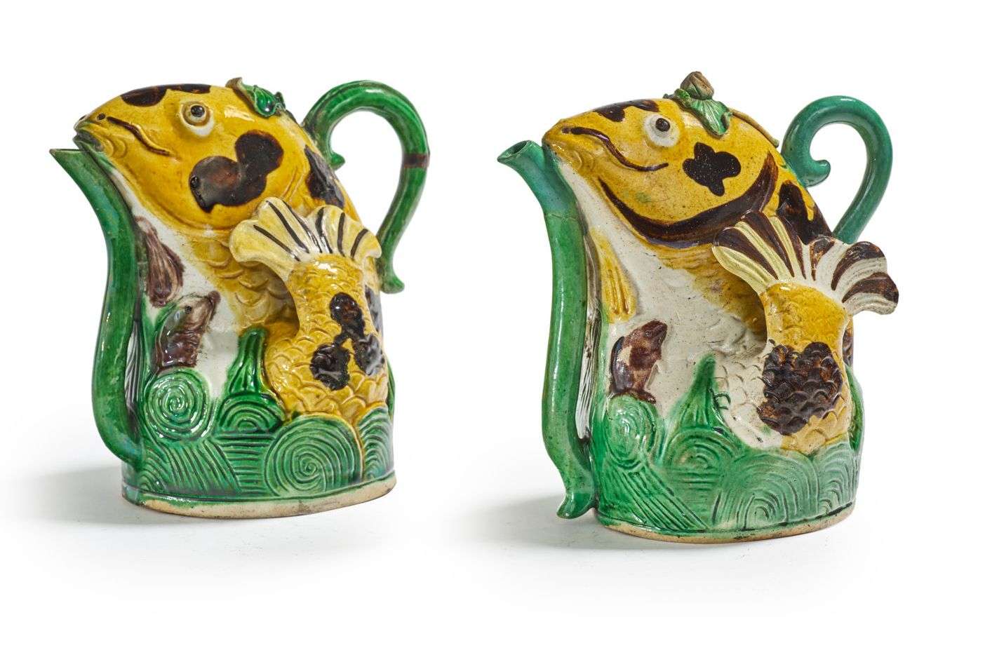 Deux théières formant pendants, reprenant la forme de carpes émergeant des flots, en biscuit et émaux sancai.