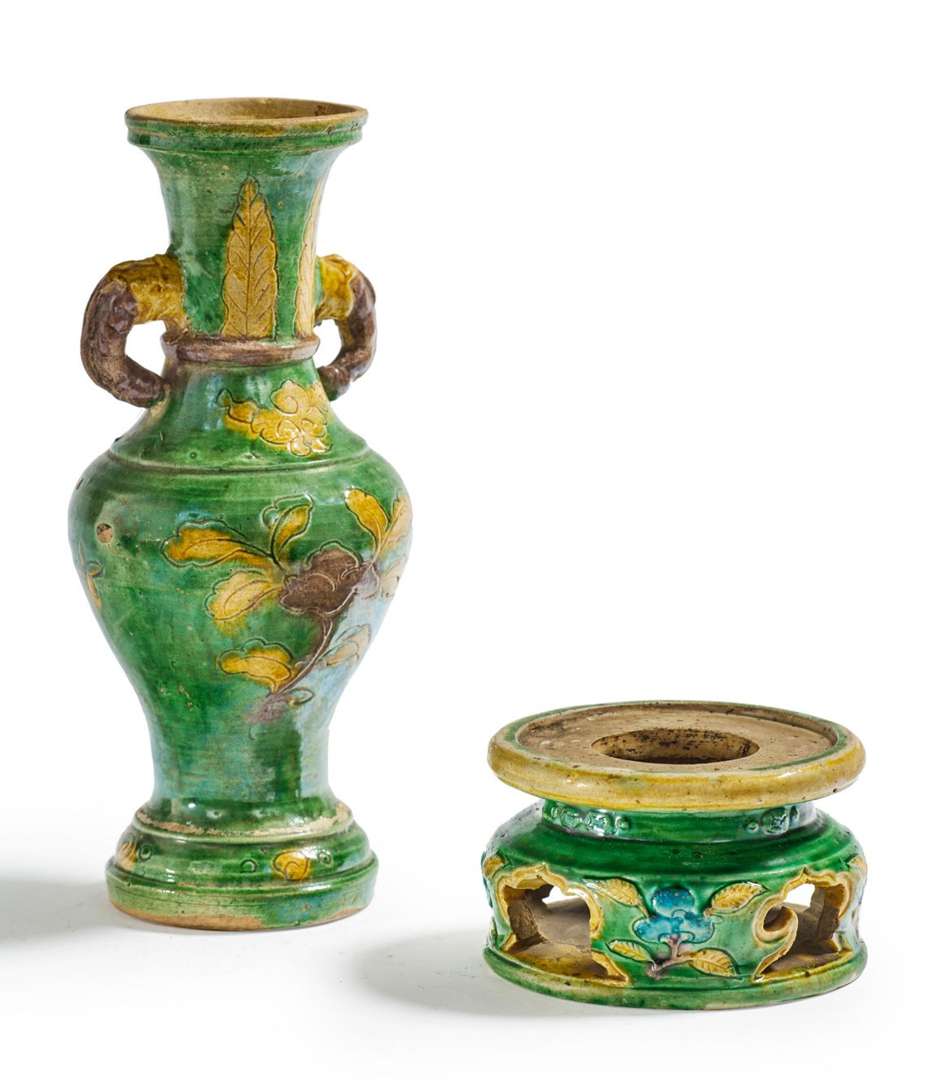 Vase balustre en céramique émaillée sancai et bleu, finement décoré de motifs de fleurs incisées, nuages ruyi et feuilles de bananiers, les anses en forme de têtes d'éléphants stylisées, et un socle à décor ajouré de ruyi.