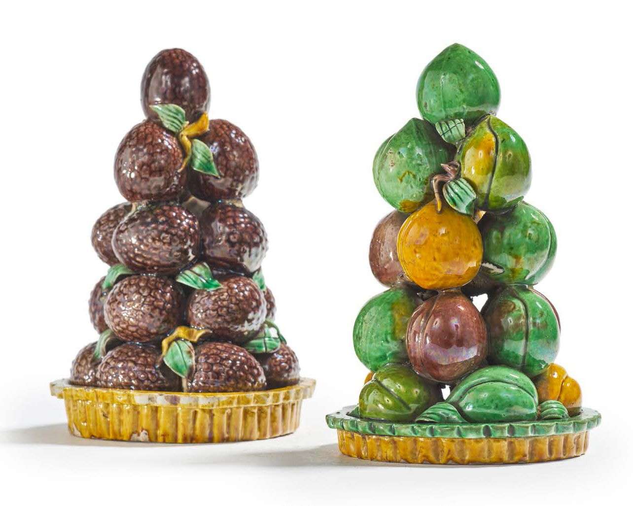 Deux groupes en biscuit et émaux sancai, en forme de pyramides formées, l'une de pêches accolées, et l'autre de litchis.