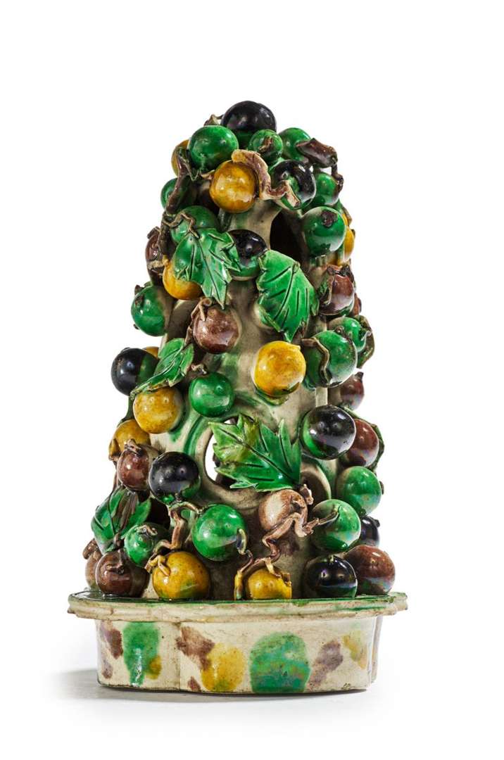 Groupe en biscuit et émaux sancai, reprenant la forme d'une pyramide de raisins et feuilles.