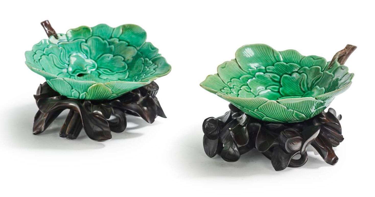 Paire de godets et compte-gouttes, en forme de feuillages, à décor moulé sous couverte émaillée vert de fleurs de lotus.
