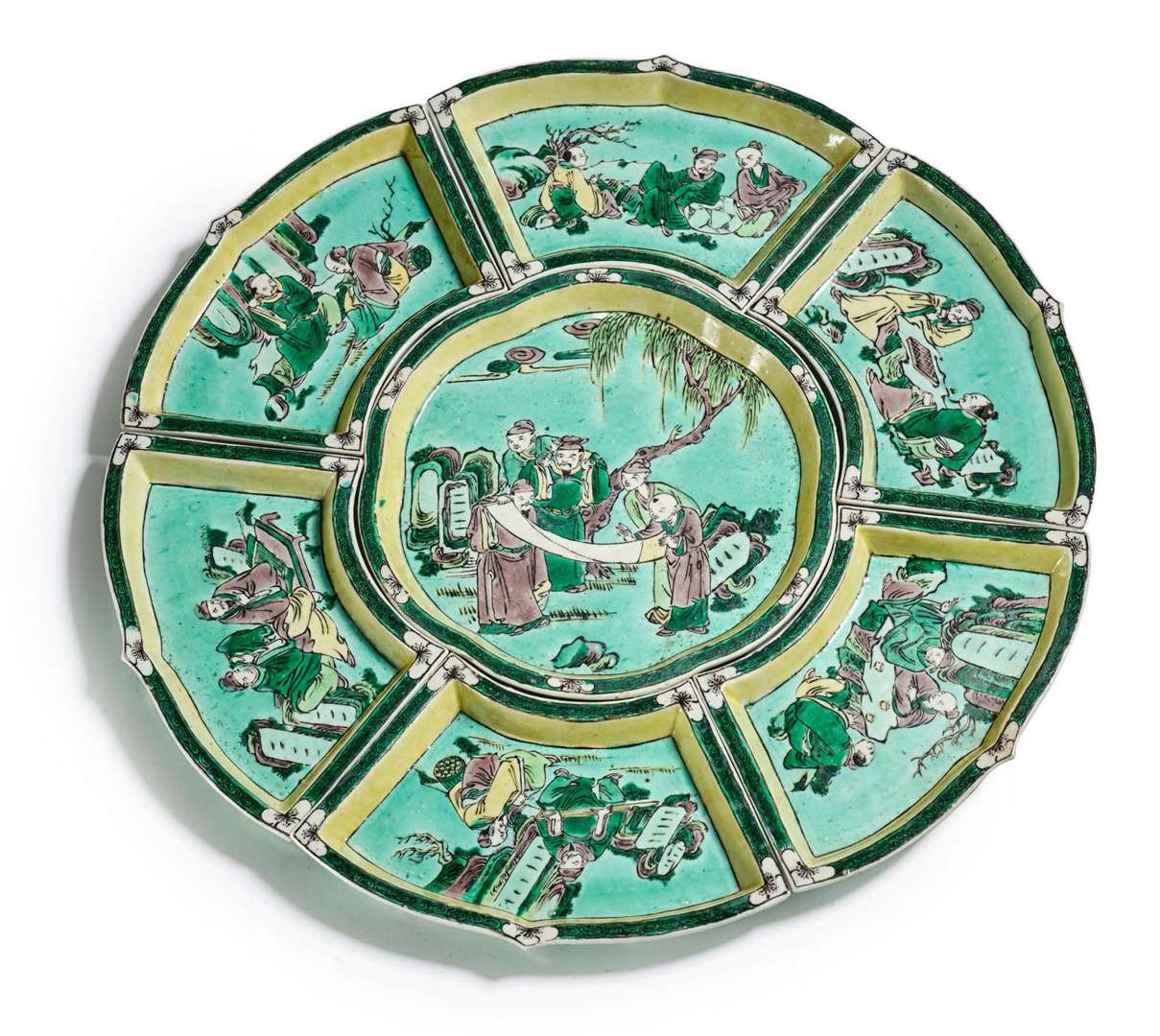 Ensemble de sept raviers en biscuit et émaux de la famille verte, formant une fleur de lotus, à décor de divertissements de lettrés, appréciant la calligraphie, jouant au go, dégustant le thé.