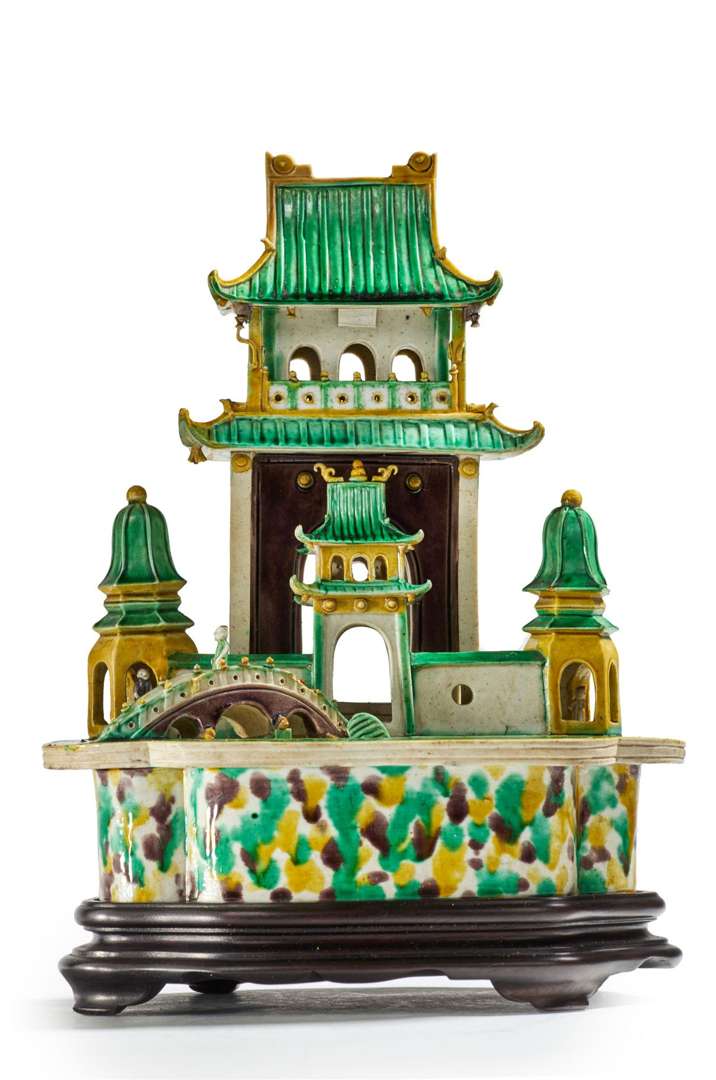 Groupe en biscuit et émaux sancai, représentant un pagodon animé de personnages, un pont traversant un bassin. Sur une base à décor arlequin.