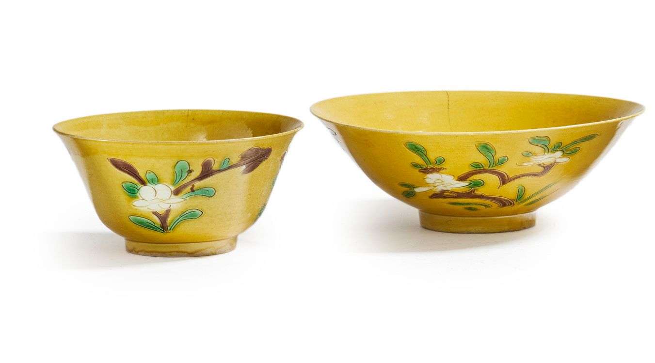 Lot comprenant deux paires de coupes, à décor en émaux sancai sur fond jaune de fleurs.