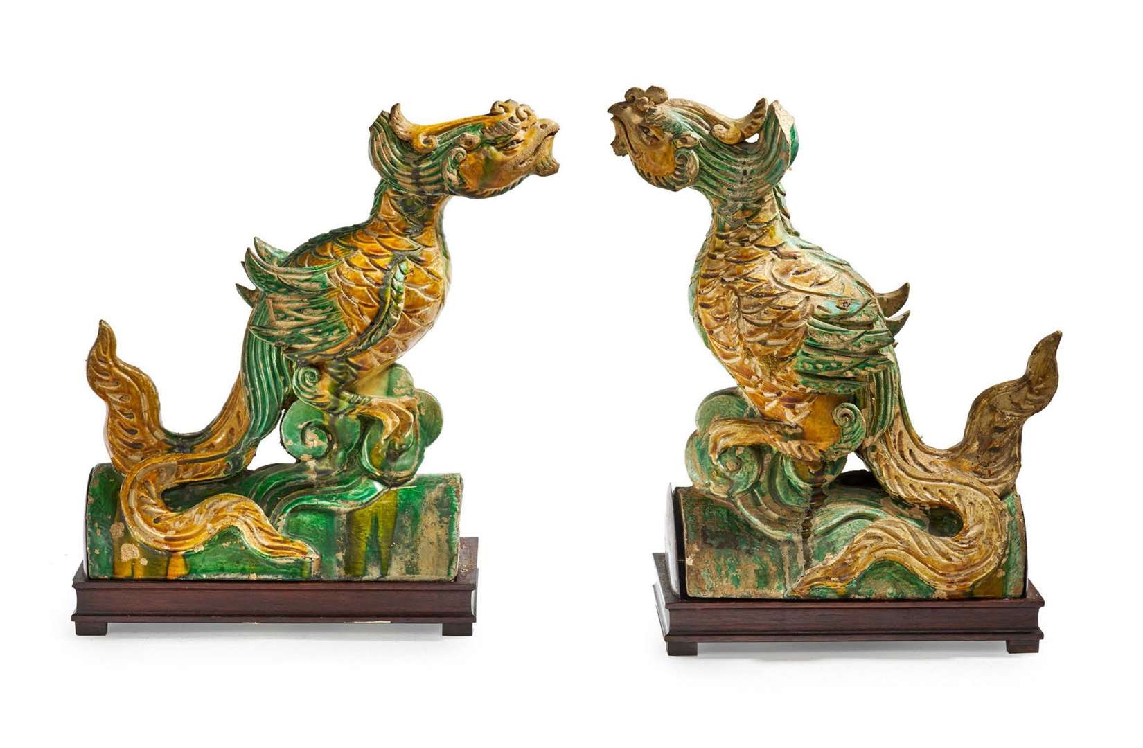 Deux tuiles faîtières en grès émaillé vert et ocre, représentant des oiseaux fenghuang.