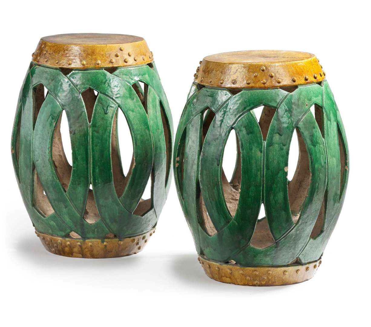 Paire de tabourets en forme de tambour, en grès émaillé vert et ocre, à décor ajouré de cercles entrelacés.