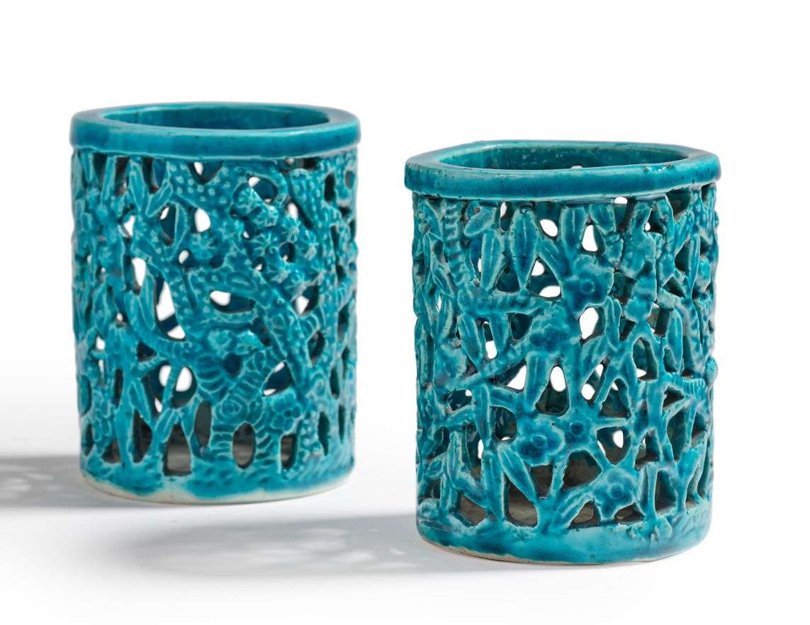 Paire de porte-pinceaux bitong en porcelaine émaillée bleu turquoise, à décor ajouré de fleurs, pins, prunus et bambous.